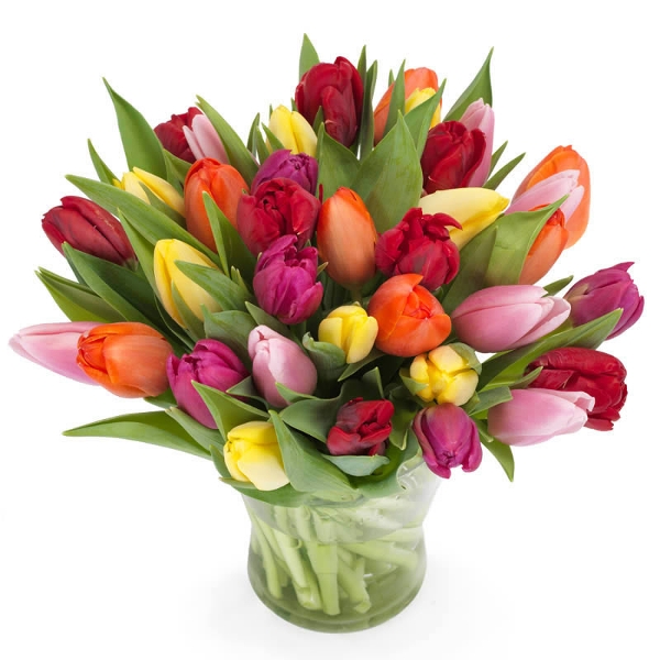 Ein taufrischer bunter Tulpenstrauß. Mit viel Sorgfalt und Liebe durch einen Floristen gebunden und zugestellt. Die Abbildung gilt lediglich als Muster. (Der Florist bindet den Strauß basierend auf Verfügbarkeit und saisonalem Preis der Tulpen). **Die Vase ist nicht inklusive.**